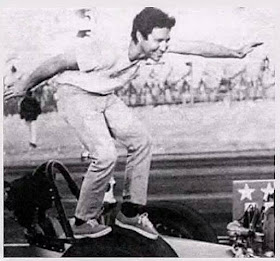 Honorary Surfer "Lotus John" Morton steered the car through its first baby steps, then went back to sports car racing. Skinner (in shades) enjoys the show in background. The Surfers earned their name with between-rounds shenanigans like this, while the competition thrashed furiously and wondered why the punks from Santa Monica enjoyed so much leisure time. Their secret was later revealed to be a 98% nitro load. Nobody saw that coming. (Charles Strutt photo courtesy of Bob Higginson)